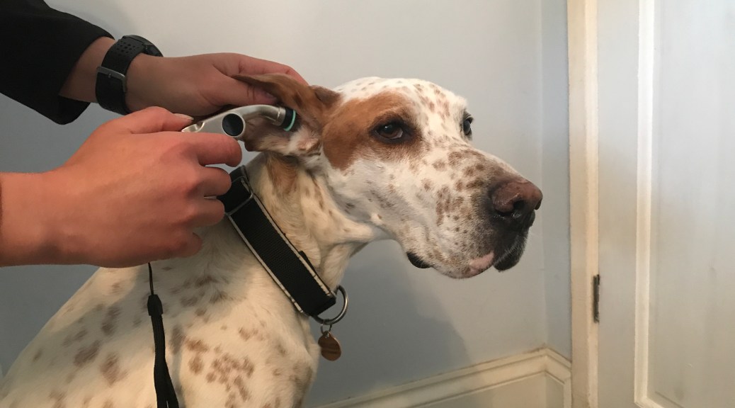 If you are going to use an ear thermometer, train your dog to accept ear handling and gradually introduce the thermometer. We’ve found most dogs tolerate the thermometer really well, but it does beep loudly.