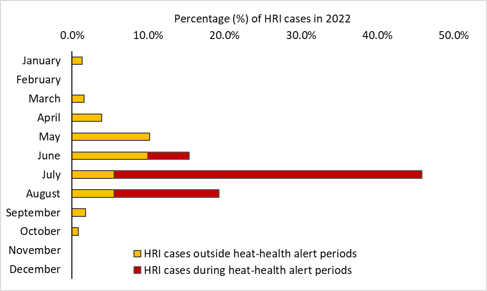 Overall, 80.5% of HRI events occurred during summer (June-August), and 74.1% of those summer cases occurred during the five heat-health alert periods declared by the UK Health Security Agency (UKHSA):