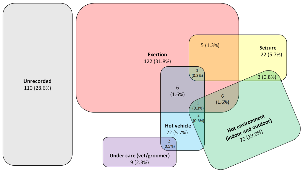 Overall, of the dogs with at least one trigger in their clinical history 51.5% included mention of exercise. However, 9.5% of cases included multiple possible triggers in the dog’s clinical history; for example the dog had been on a walk, in hot weather, then transported in a hot vehicle to the veterinary practice. Any, or all of those triggers could have contributed to the dog’s condition.